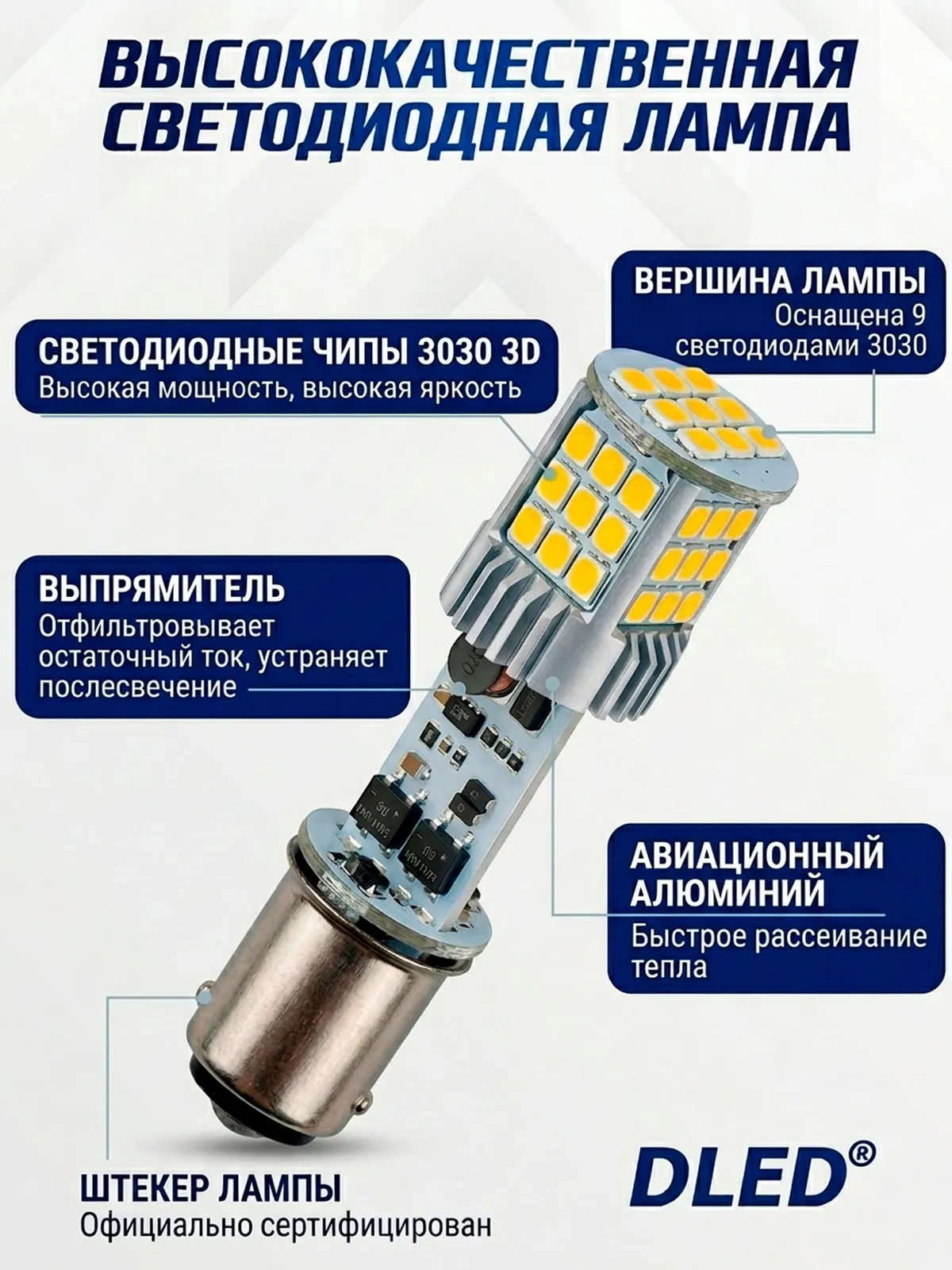 Светодиодная автомобильная лампа P21/5W BAY15d, бренд DLEDЭто отличное решение для тех, кто ищет яркое, долговечное и экономичное освещение для своего автомобиля. Эти лампы обеспечивают высокую яркость, энергоэффективность, долговечность и простоту установки, что делает их идеальным выбором для замены старых или неэффективных ламп в автомобиле. Установив эти лампы, вы улучшите видимость на дороге, сделаете ваш автомобиль более заметным и повысите его безопасность.