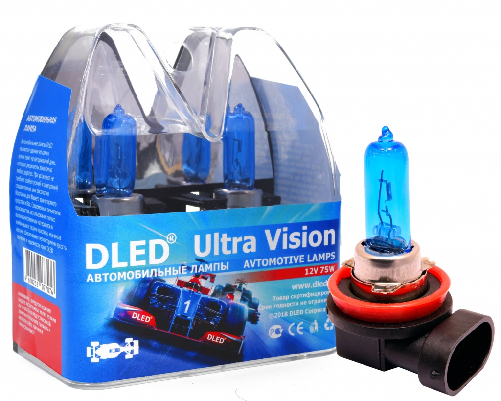 Автомобильные лампы DLED Ultra Vision с цоколем H11 - стильные лампочки ярчайшего свечения, обеспечивающие освещенность дороги на максимально возможном уровне для галогенного автомобильного света. Характеристики светопотока были улучшены даже в сравнении с недавно выпущенной линейкой Night-Vision - теперь яркость светового излучения и дальность освещаемой территории превышает показатели стандартного галогена уже более чем на 150%!