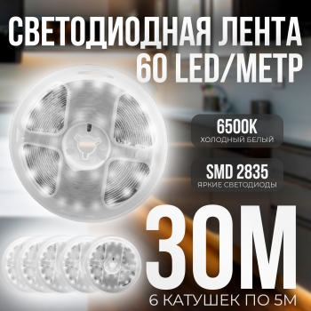 (6 катушек 5м) Светодиодная лента IP22 SMD 2835 (60 LED/M) 12V DC Белый 6500K 30 метров