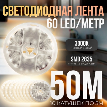 (10 катушек 5м) Светодиодная лента IP22 SMD 2835 (60 LED) 12V DC Теплый Белый 3000K 50м