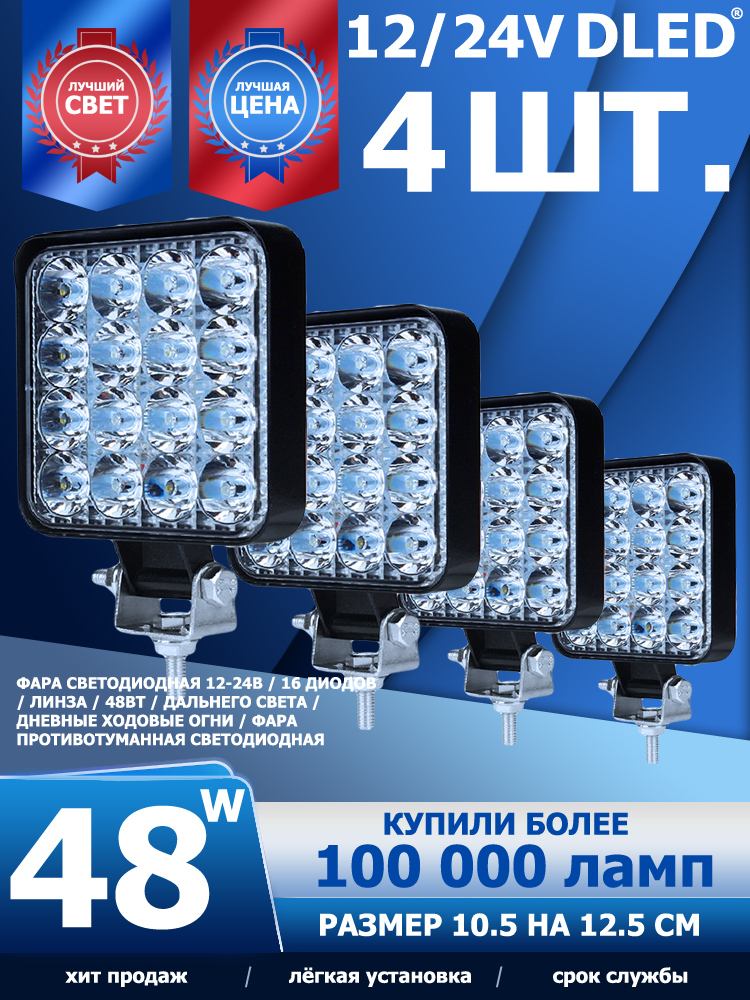 Фара светодиодная 12-24В Бренд DLED - 16 диодов c линзой 48Вт дальнего света квадратной формы (4шт-фары.)