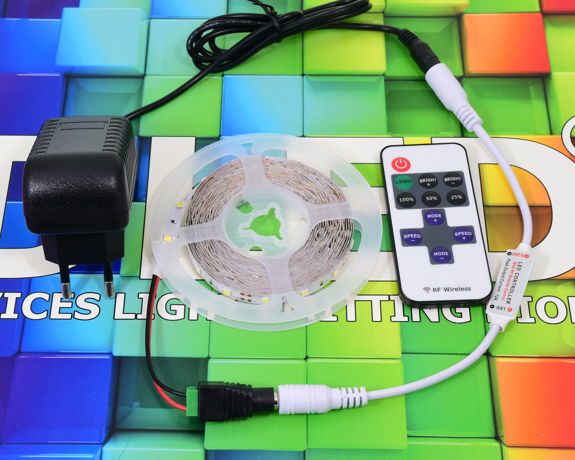 Компалект оснащен димером для управления яркости светодиодной ленты и есть режим моргания, который можно тоже регулировать:
