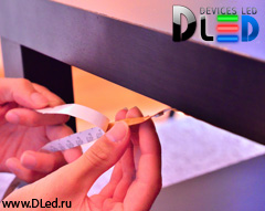 Установка светодиодной ленты также не вызовет сложностей. На обратной стороне вы найдете липкий монтажный слой, закрытый защитной бумагой. Снимите защитную бумагу, приложите ленту на чистую поверхность и прижмите посильнее. Если лента оказалась слишком длинной, ее нужно укоротить. Для этого на ленте есть специальные линии. Делая разрезы по этим линиям вы сохраните полную работоспособность ленты. После монтажа подключате ленту к блоку питания, а блок питания в розетку.
