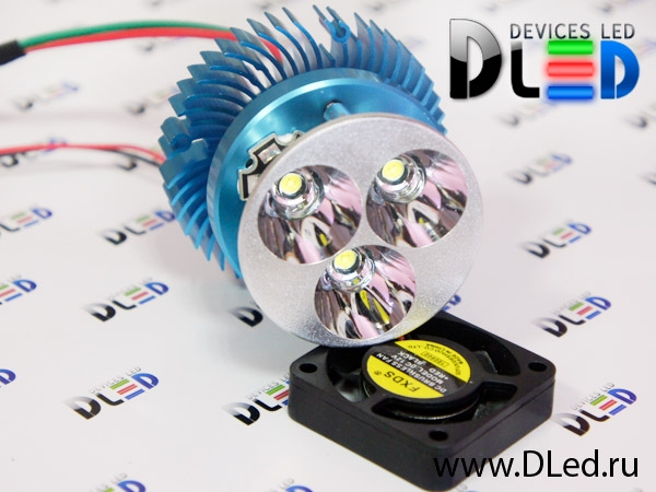 Универсальная светодиодная лампа HID-LED-9W светодиодный аналог линзовой оптики. Лампа представляет собой массивный алюминиевый радиатор с установленными на нём 3 светодиодами Cree мощностью 3 ватта каждый, общий световой поток лампы 1080 Люмен, с задней стороны на радиаторе устанавливается компактный вентилятор для охлаждения светодиодов. Фокусировка света происходит за счёт того что каждый светодиод имеет отдельный отражатель.